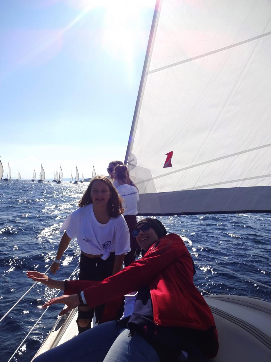 Der zweite Höhepunkt nach dem Friedensfest ist die Formationsfahrt am Donnerstag bei der alle Schiffe nacheinander den Hafen verlassen und dann gemeinsam durch die Bucht fahren. Gleichzeitig setzen alle Crews die Segel, hissen ihre selbstgemalte Friedensfahne und segeln aus der Bucht auf das offene Meer. Dieser Moment war für alle ein Gänsehautmoment!