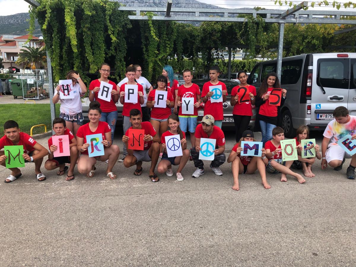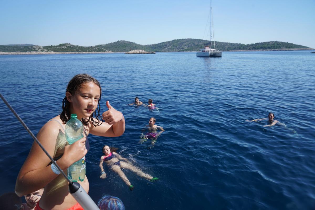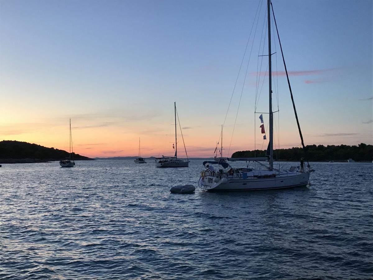 Nach einem schönen Abend und einer ruhigen Nacht in Rogac haben die Kids am vormittag Ideen für den Auftritt auf dem Friedensfest gesammelt. Mittags ging es los Richtung Badebucht. Dort hatten alle einen entspannten Nachmittag im Wasser und in der Sonne. Um 18 Uhr legten die vier Schiffe ab. Da eine Nachtankunft in der Marina Kastela geplant war, haben alle ihre Sicherheitsgurte und Rettungswesten angelegt. Unter Segeln genossen wir einen phantastischen Sonnenuntergang auf dem Wasser. Bei der Anfahrt auf den Hafen galt es verschiedene Leuchtfeuer, die uns den Weg weisen, zu finden. Um ca. 21 Uhr waren unsere vier Schiffe nach einem ereignisreichen Tag sicher im Hafen.