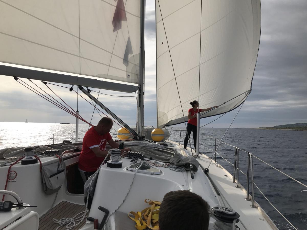 Aber auch der schönste Moment geht zu Ende – die Flotte löste sich auf und alle Schiffe machten sich auf den Weg Richtung Heimathafen. Unsere kleine Nürnberger Flotte konnte den kräftigen Wind nutzen, um einen ordentlichen Schlag nach Norden zu machen. Nach dem langen und für einige sehr anstrengenden (einige hatten mit Seekrankheit zu kämpfen) Tag an Bord legten wir in Kremik an.